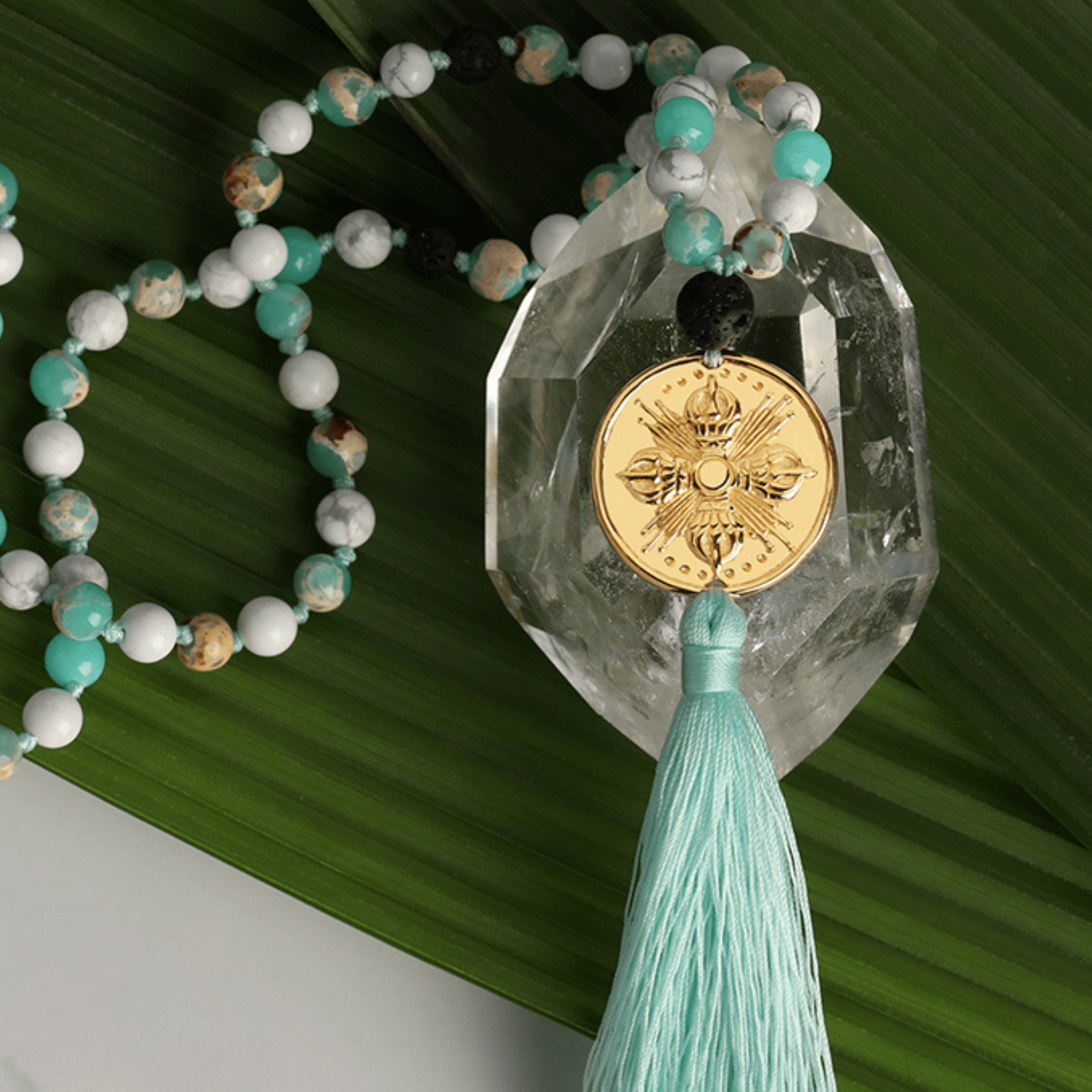 - Traditional mala style of 108 prayer beads: Ocean Jasper, Howlite, and Lava Rock
